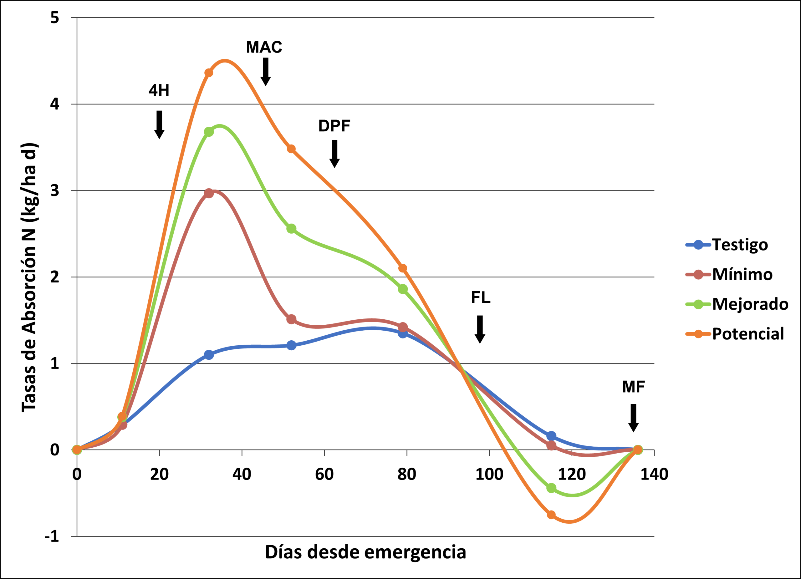 Figura 1: tasa de absorsión total de nitrògeino promedio para el ciclo del cultivo segùn tratamientos. Referenicas: 4H: cuatro hojas (fertilización principal N) ; MAC: macollaje; DPF: diferenciaciòn de primordio de floral (segunda dosisi N) ; FL: floración; MF: maduracion fisiológica