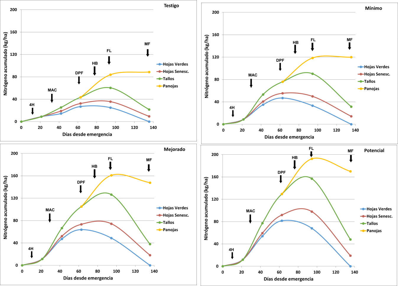 En las figuras siguientes se puede apreciar como el N se absorbe y acumula en las diferentes partes de la planta a lo largo del ciclo (Figura 2). Con baja disponibilidad de N, en los tratamientos Testigo y Mínimo, la acumulación de N en tallos y hojas apenas supera los 80 kg ha-1. En los tratamientos Mejorado y Potencial, con mayores dosis de N acompañadas de Zn y S, se llegó a 160 N kg ha-1, que luego son removilizados en alta proporción hacia los granos.