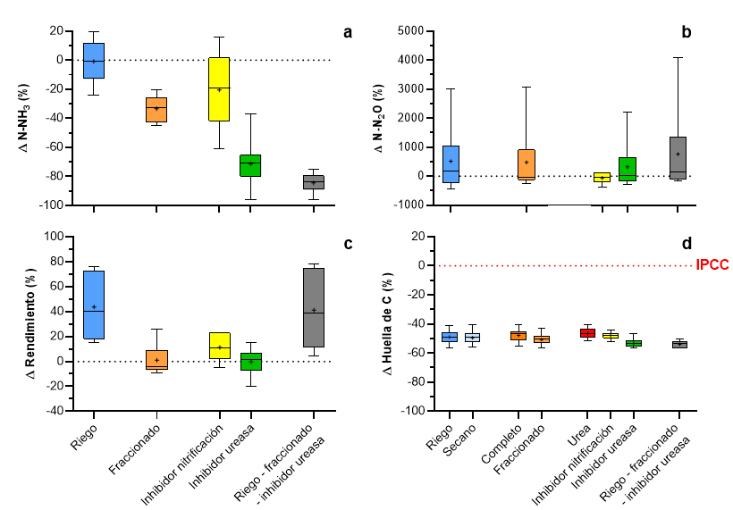 Figura 1. Cambio en las pérdidas por volatilización de NH3 (a), en la emisión de N2O (%) (b), en el rendimiento (c) y en la huella de carbono (d) respecto a una situación de referencia, para cada uno de los factores evaluados (régimen hídrico, estrategia de fertilización y fuente de N) (a y b). Para las figuras a, b y c, la línea punteada indica el tratamiento de referencia (Dosis completa de Urea aplicada en V4 bajo condiciones de secano) (45,8 kg ha-1, 69,4 g ha-1 y 11,8 t ha-1 para volatilización, emisión de N2O y rendimiento, respectivamente), mientras que para la figura d, la situación de referencia es la huella de carbono calculada con los factores de emisión propuestos por el IPCC (2716 kg CO2-eq ha-1).