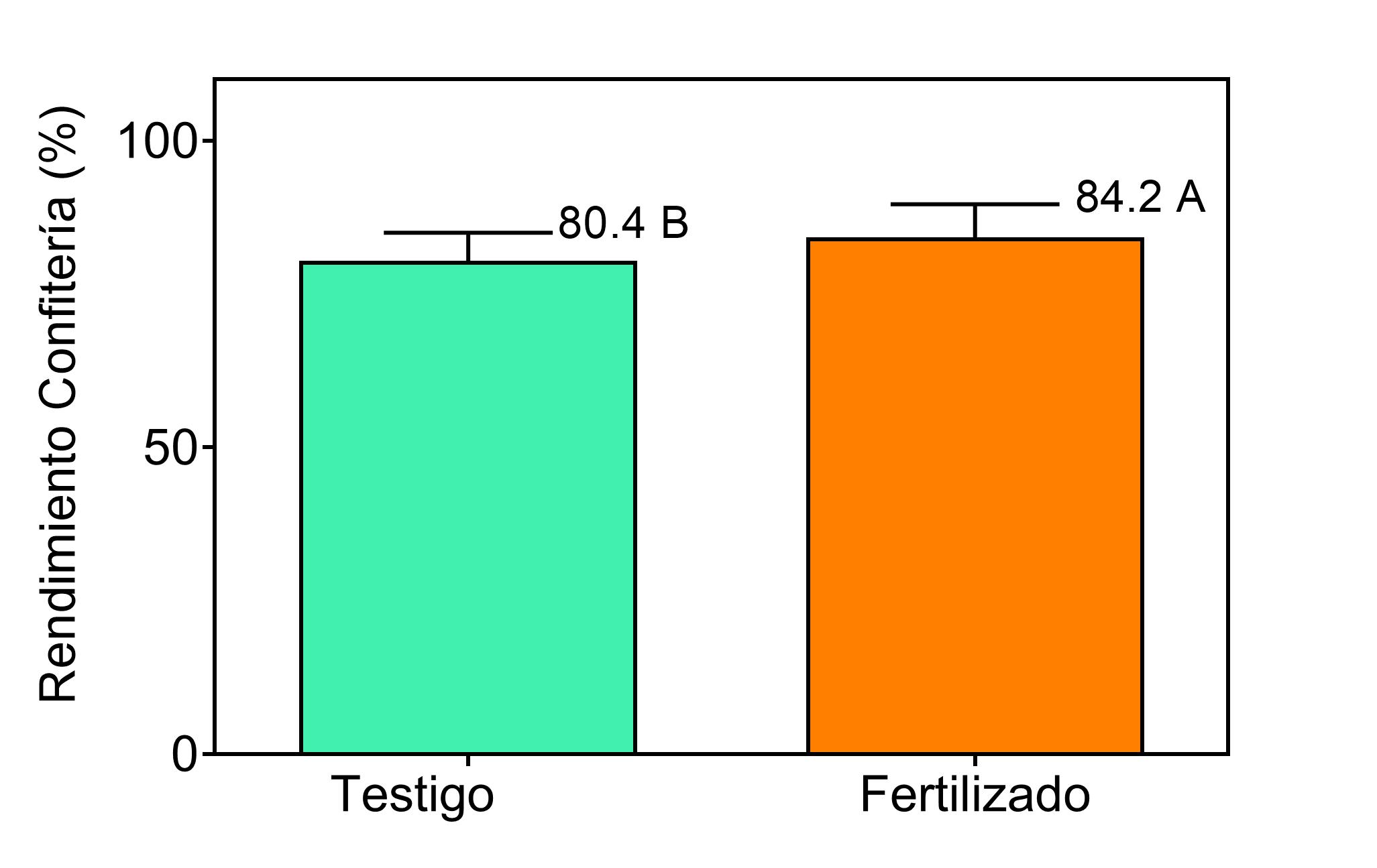 En 2020/21, el rendimiento promedio en frutos del control fue de 6109 kg ha⁻¹; los tratamientos con fertilización moderada (T2 y T6) produjeron en promedio 333 kg ha⁻¹ (5,4 %) más que el testigo, mientras que los tratamientos con mayor nivel de fertilización (T4 y T5) alcanzaron cerca de 7000 kg ha⁻¹, equivalentes a un incremento del 14 %.