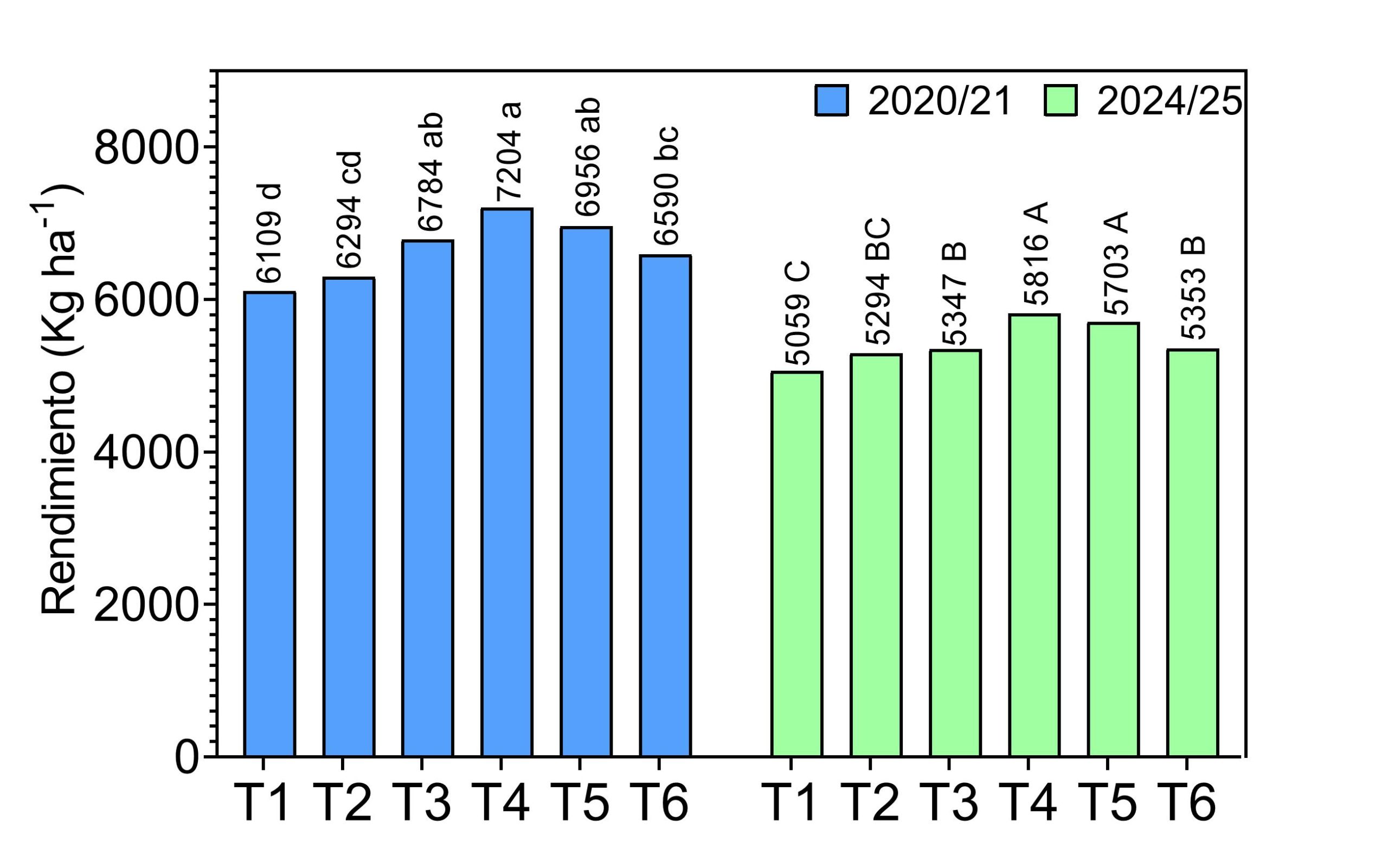 En el ciclo agrícola 2024/25, bajo condiciones de mayor humedad, las diferencias se mantuvieron: el testigo produjo 5059 kg ha⁻¹ y el tratamiento balanceado (T5) 5703 kg ha⁻¹. La consistencia en la respuesta demuestra que los efectos residuales de la nutrición balanceada persisten incluso tras varios ciclos de rotación. Por su parte, los tratamientos T3 (fertilización recomendada promedio) y T6 (básica) también superaron significativamente al testigo, con rendimientos intermedios de 5347 y 5353 kg ha⁻¹ respectivamente, confirmando el valor de estrategias nutricionales completas aun con menores dosis de aporte.