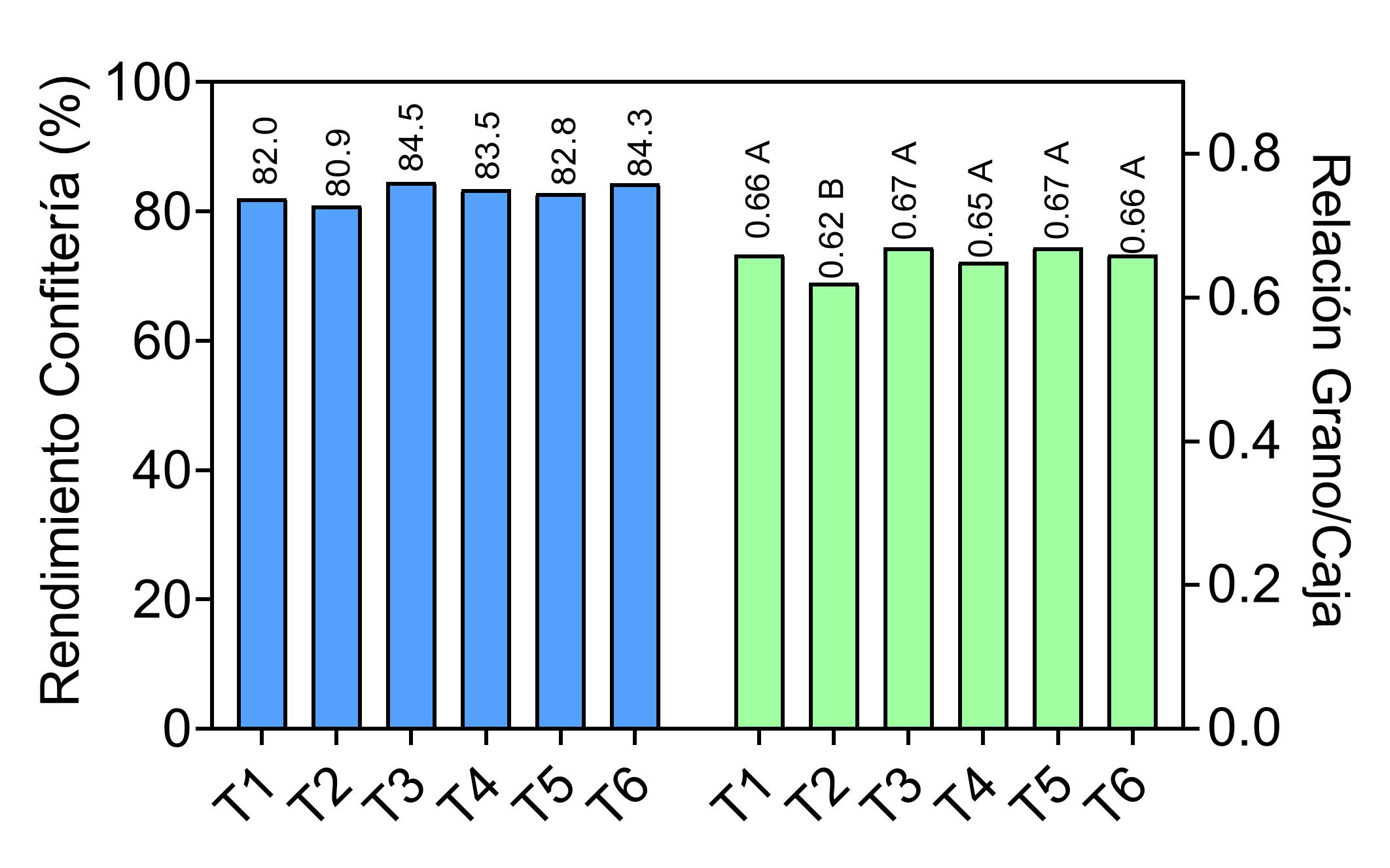 Figura 3: Porcentaje de maní confitería (Barras azules) y relación grano/caja (barras verdes) en Río cuarto (Córdoba) según estrategia de manejo previo de la fertilización de cultivos en rotación desde 2016/17. La descripción de los tratamientos (T1 a T6) se presentanen el promedio de nutrientes aplicado en maíz y soja según estrategias de fertilización) por cada ciclo agricola, medias con una mismna letra no difieren significativamente (p>0,05) según LSD-Fisher.